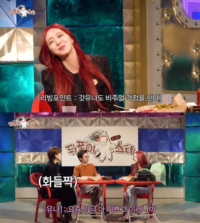 유나는 '식단 관리도 하고 있냐'는 질문에 "신경 써서 하고 있다. 옷도 타이트하고 얼굴도 클로즈업해서 잡고, 요새 (아이돌들) 얼굴이 다 예쁘지 않냐"며 "(비주얼 걱정을) 매일 한다"고 밝혔다.