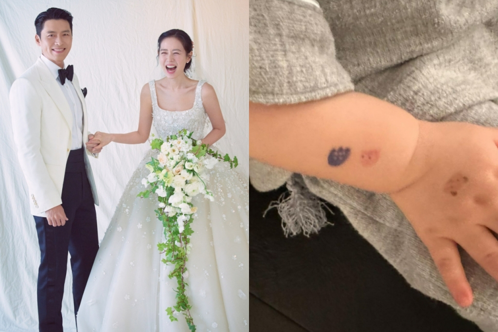사진에는 온몸에 도장 놀이를 한 듯한 현빈·손예진 부부 아들 '알콩이'의 모습이 담겼다. 알콩이의 앙증맞은 손발이 보는 이들에게 훈훈함을 안긴다.