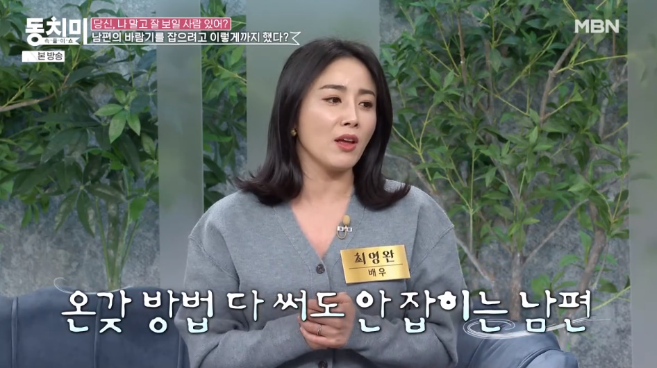 갖은 방법을 다 써봤지만 남편이 달라지지 않자 최영완은 "이혼해야겠다 싶더라. '사랑과 전쟁' 한창 할 때라 이혼에 대해 잘 알고 있었다. 증거를 수집하고 있는데, 그러고 있는 내 모습이 너무 싫더라"라며 울컥했다.