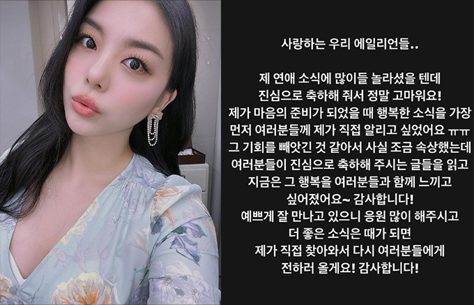 에일리는 "지금은 여러분이 진심으로 축하해주시는 글을 읽고 그 행복을 함께 느끼고 싶어졌어요. 감사합니다"라며 "예쁘게 잘 만나고 있으니 응원 많이 해주세요. 더 좋은 소식은 때가 되면 제가 직접 찾아와서 다시 여러분께 전하러 올게요. 감사합니다"라고 글을 맺었다.