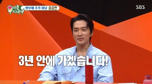 송승헌은 "앞으로 3년 안에 (장가를) 가겠다고 말했다"며 "근데 그렇게 (다짐을) 3년마다 갱신 중"이라고 밝혀 웃음을 안겼다.