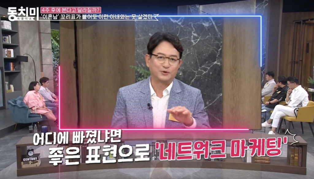 그는 "어느 날 퇴근하고 집에 가니 모르는 사람들이 와 있었다. 아내와 함께 그 일을 하는 사람들이었다. 모르는 사람들이 집에 와 있는 게 싫었다. 이게 벌이가 안 되는 걸 왜 깨우치지 못할까 싶었다"며 아내에게 다단계를 그만두지 않으면 헤어지겠다고 말했다고 털어놨다.