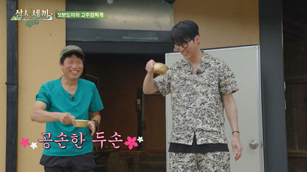 다만 그 ‘조금의 기대’가 상상 이상의 효과로 다가왔다. 동갑내기 두 배우는 평소 생활과는 확연히 다를, 자연과 맞닿은 환경 속에서 서로에게 의지하며 ‘자급자족 생활’이라는 하나의 주제를 완성하기 위해 매 순간 힘을 합쳤다. 인간에게 주어진 가장 크고 어려운, 오히려 그래서 쉬운 주제일지 모를 ‘먹고사니즘’을 해결하기 위해 자연에 나섰고, 자연과 맞섰다. 때로는 자연이 내어준 좋은 재료들에 행복해했고, 때로는 어느 것 하나 손에 쥐지 못해 바다마을에 살면서도 바닷물 냄새만 맡는 날도 있었다. 무차별적으로 쏟아지는 비와 강한 바람에 살림살이가 모두 날아가는 상황 속에도 집안의 설비를 책임지는 유해진은 불씨와 싸우며 힘겹게 불을 붙였고, 요리를 책임지는 차승원은 그 가운데 소박한 한 상을 차려냈다.