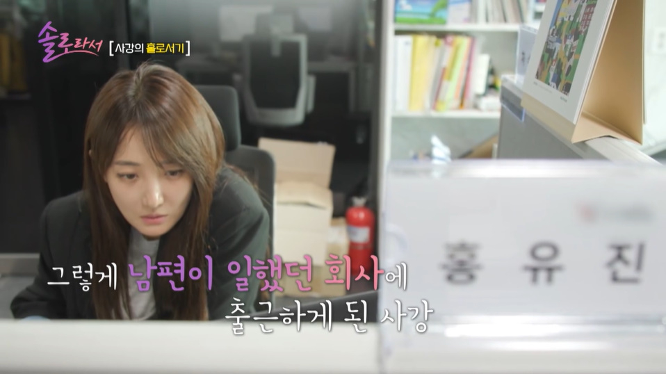 그렇게 사강은 남편이 일했던 회사에서 일하게 됐다고. 사무실 한켠에는 사강 남편의 유품이 남아 있어 눈길을 끌었다.