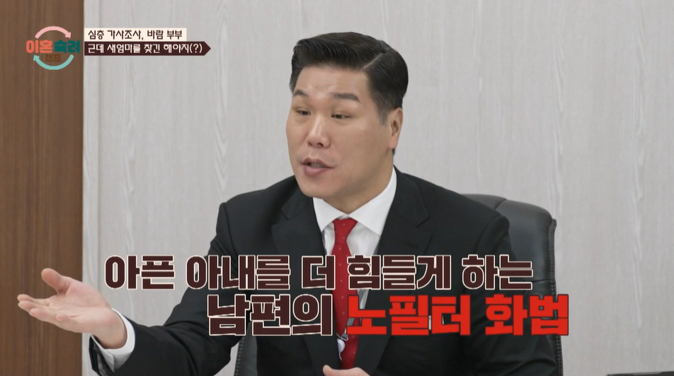 남편의 외도 중 아내는 유산의 아픔까지 겪어야 했지만 남편은 아내에게 "성관계는 안 했다", "아무 일도 없었다", "정신적 외도일 뿐"이라고 변명했다.