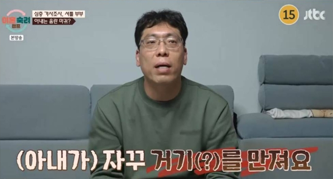 남편은 남도 아닌 가족들 앞에서 이런 얘기를 꺼내는 게 싫다며 "저는 와이프가 같이 걸어가면 자꾸 거기(성기)를 만진다"고 털어놔 모두를 깜짝 놀라게 했다.