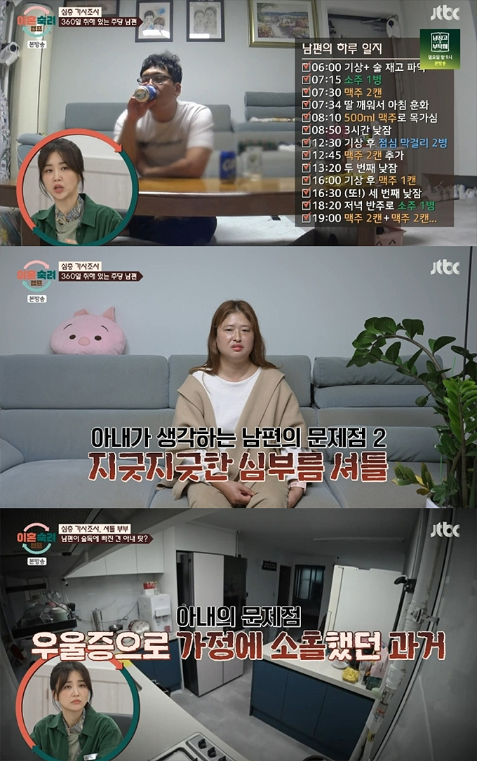 이날 365일 중 360일 음주하는 남편의 모습이 공개돼 충격을 안겼다. 아내는 종일 술 셔틀, 안주 셔틀 등 각종 심부름을 해야 했다.