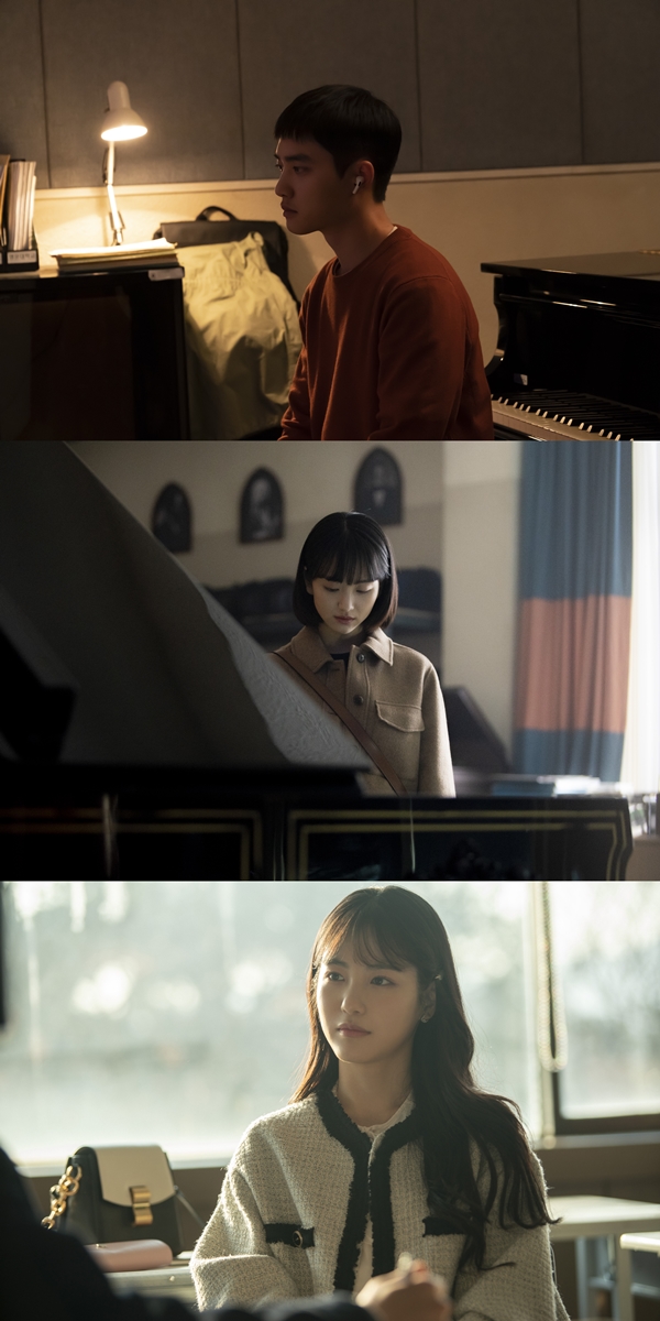 첫 번째 스틸은 어두운 방에 앉아 생각에 잠긴 듯한 유준(도경수)의 모습을 담았다. 정아(원진아)와의 만남이 유준에게 어떤 감정적 요동을 안겨줄지 귀추가 주목되는 가운데, 멍하니 피아노 건반을 바라보는 정아의 모습도 눈길을 끈다.