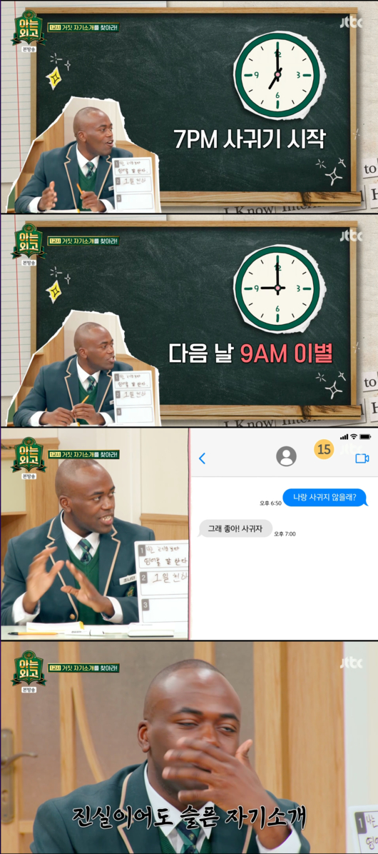 조나단은 "정확히 오후 7시에 사귀어서 다음 날 오전 9시에 헤어지자는 통보를 받았다"라고 말해 웃음을 자아냈다.