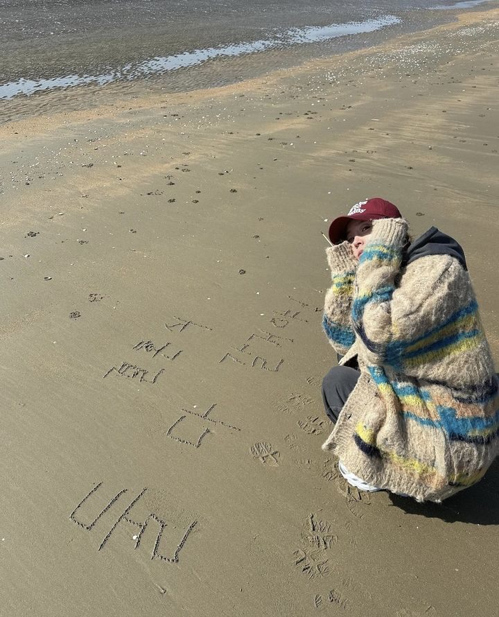 신지가 바닷가 모래사장에 '결혼식 둘 다 갈거야'라고 적힌 글씨 앞에 앉아있는 사진도 함께 올렸다.