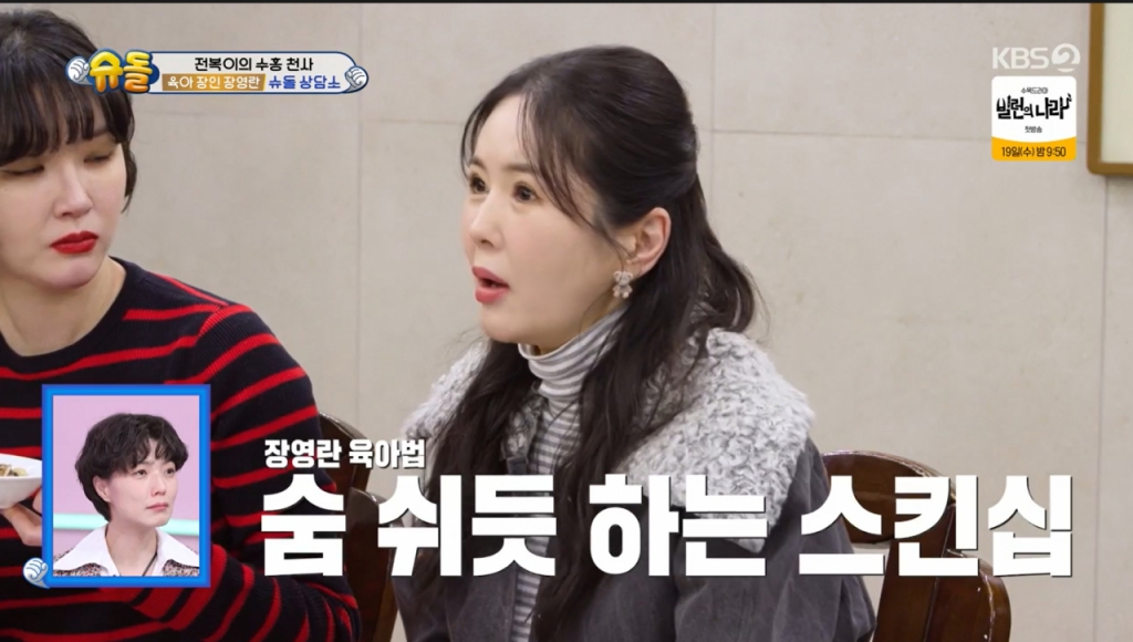 장영란은 "정서적인 교감이 정말 중요하다. 학교 다녀와서 뭐 했는지, 고민이 뭔지 물어본다. 그리고 가장 중요한 건 스킨십이다. 그때 나도 힐링을 받는다. 하루에 한 번 이상은 무조건 안아주고 뽀뽀해준다"고 말했다.