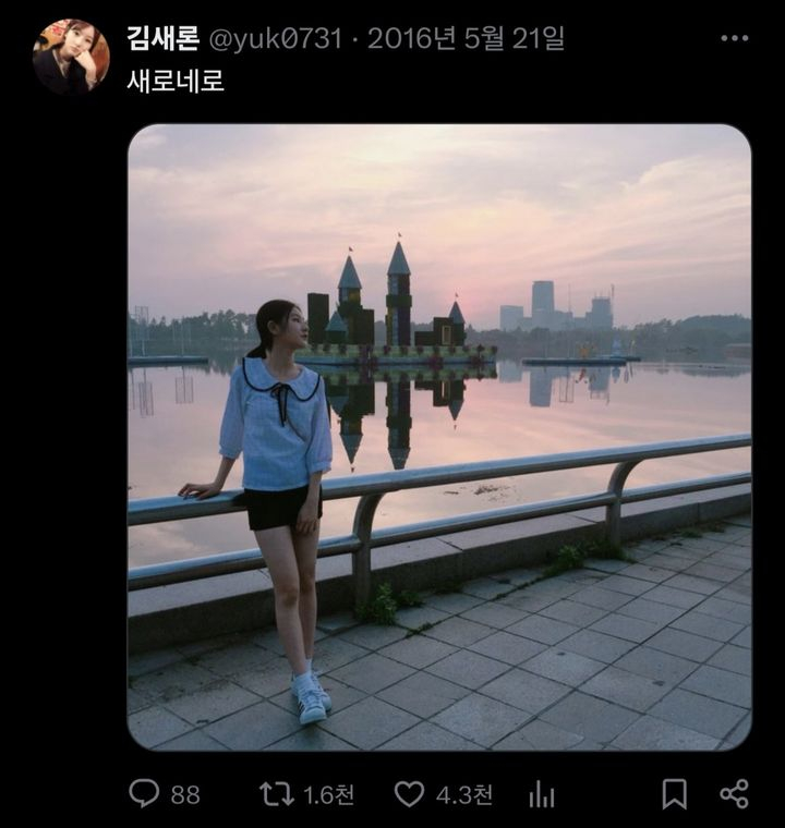 김새론은 2016년 5월21일 본인의 엑스(X·구 트위터)에 "새로네로"라고 적고 사진 한 장을 올렸다. 사진 속에서 김새론은 노을이 진 풍경을 배경으로 포즈를 취하고 있다.