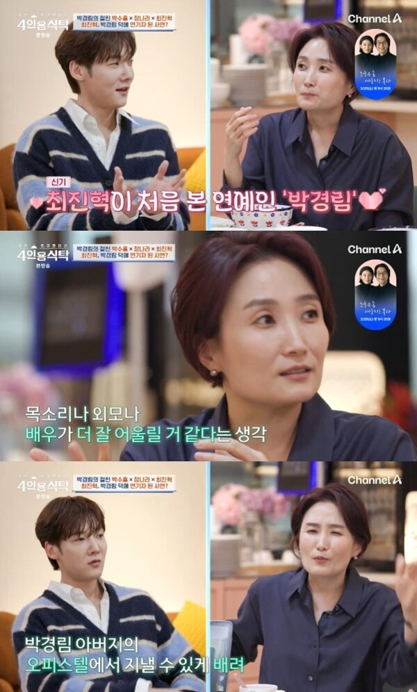 지난 24일 방송된 채널A '절친 토큐멘터리 4인용식탁'에는 박경림이 방송인 박수홍, 배우 장나라, 최진혁을 초대해 이야기를 나누는 모습이 담겼다.