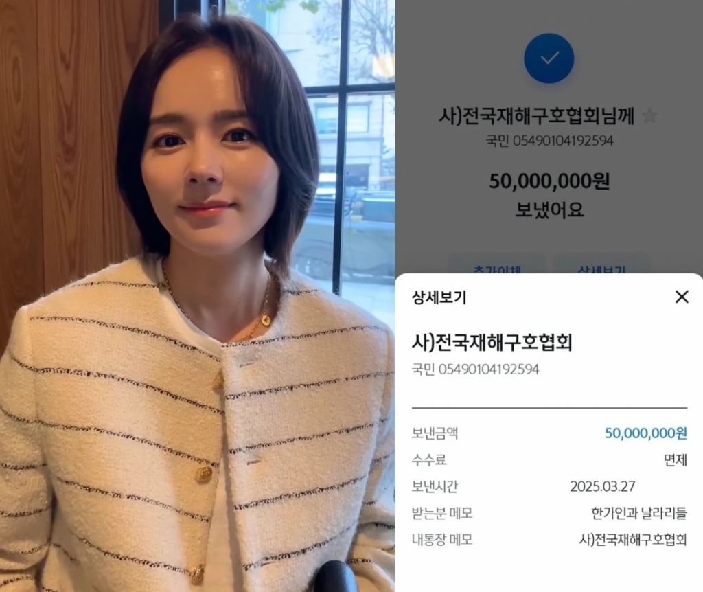 한가인은 그러면서 사단법인 희망브리지 전국재해구호협회에 '한가인과 날라리들'이라는 이름으로 5000만원을 송금한 화면을 갈무리해 올렸다. '날라리들'은 한가인 유튜브 구독자 애칭이다.