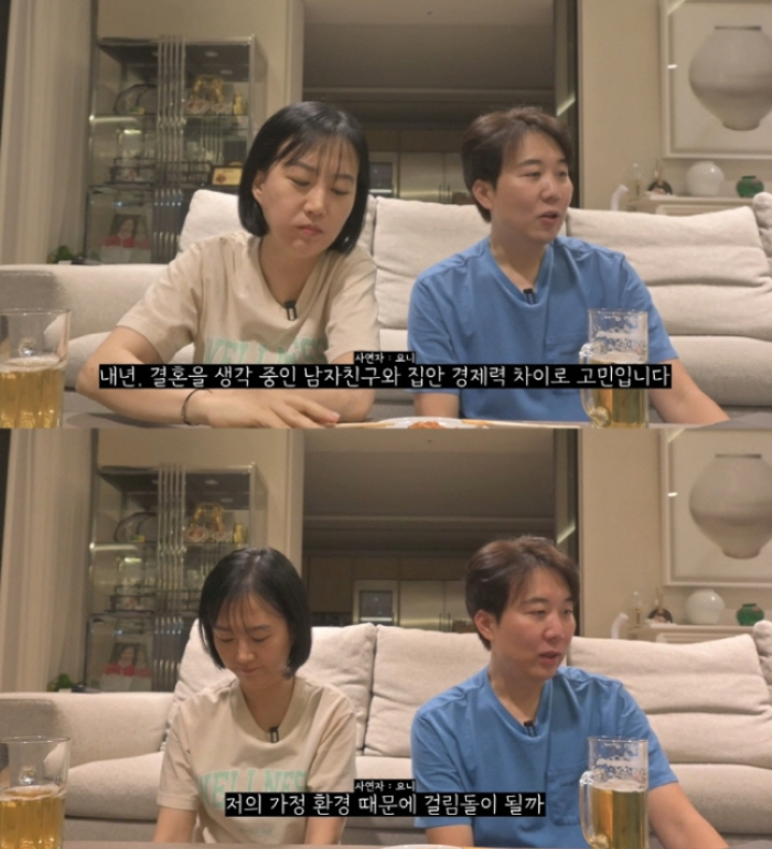 이날 소개된 사연은 이렇다. 결혼을 앞두고 있다는 구독자는 양가 집안의 경제력 차이가 커 고민이라고 한다. 구독자는 남자친구와 모든 면에서 잘 맞지만, 노후 준비를 해둔 예비 시부모와 달리 자신의 부모는 이혼 상태에 벌이도 없어 주눅이 든다고 했다.