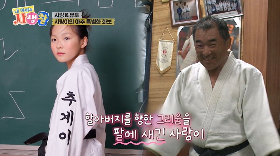 이어 야노 시호는 "돌아가신 할아버지에 대한 마음이 담겨 있다"며 사진 속 사랑 양이 입은 유도복 왼쪽 팔에 할아버지 '추계이'의 이름을 새긴 것을 언급했다.