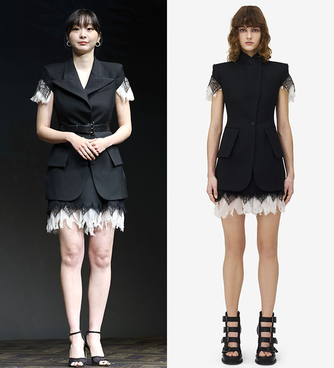 이날 김다미가 착용한 의상은 패션 브랜드 '알렉산더 맥퀸'(Alexander McQueen)의 거미줄 레이스 슬리브리스 재킷과 미니스커트다.