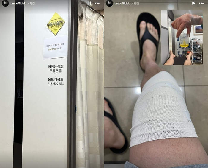 사진에서 이루는 무릎에 붕대를 감고 있다. 무릎에 물이 차 치료를 받은 것으로 보인다.