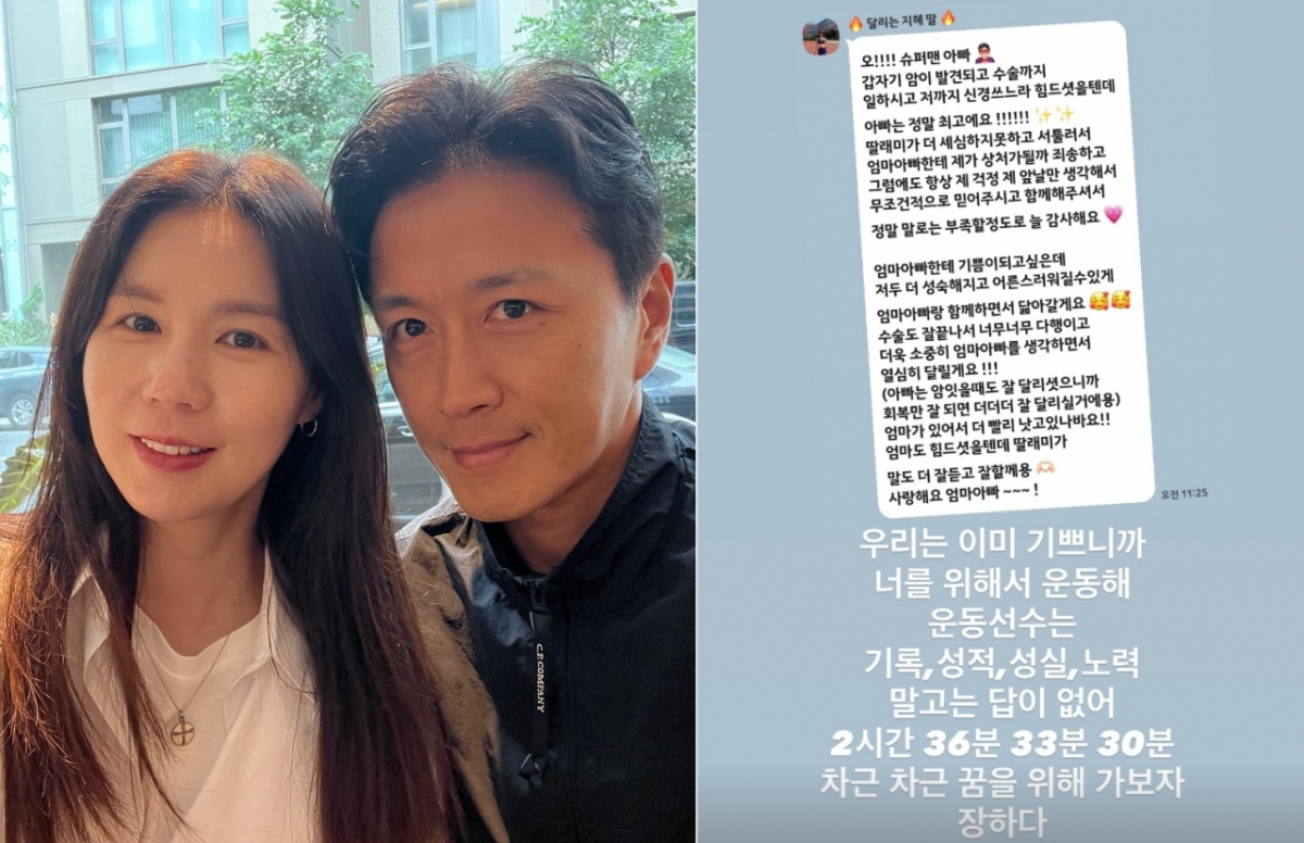 이어 "수술도 잘 끝나서 다행이다. 엄마가 있어서 더 빨리 낫고 있나 보다"라며 "엄마 아빠를 생각하며 열심히 달리겠다. 아빠는 암이 있을 때도 잘 달렸으니 회복만 잘 되면 더 잘 달릴 것"이라고 용기를 북돋웠다.
