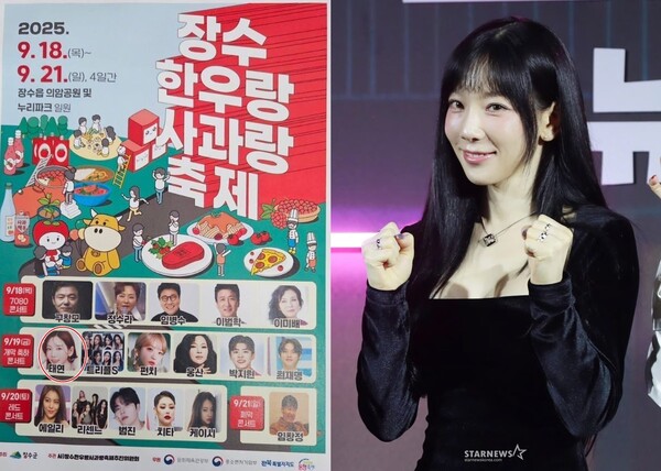 오는 9월 18일부터 21일까지 열리는 ‘2025 장수 한우랑 사과랑 축제’ 공식 포스터에는 9월 19일 콘서트 출연진으로 태연의 이름과 사진이 함께 실렸다. 하지만 아이즈(IZE) 확인 결과 이는 오기재로, 해당 무대의 실제 출연자는 TV조선 '미스트롯2' 출신의 트로트 가수 김태연이다.
