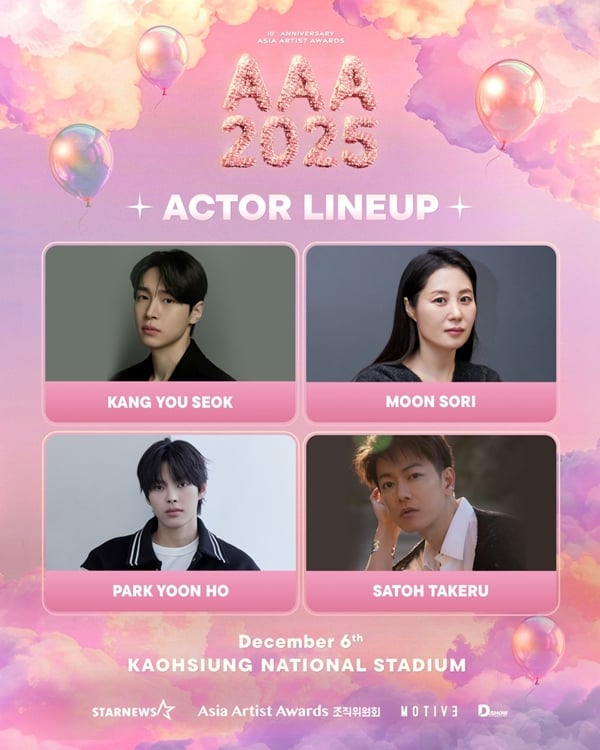 오는 12월 6일 가오슝 내셔널 스타디움에서 펼쳐지는 '10주년 아시아 아티스트 어워즈 2025(10th Anniversary Asia Artist Awards 2025, 이하 '10주년 AAA 2025')'에 배우 강유석, 문소리, 박윤호, 사토 타케루, 엄지원, 이준혁, 최대훈, 추영우(가나다 순)가 출연을 확정 지었다.