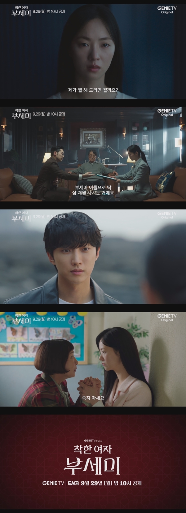 오는 29일 오후 10시 첫 공개되는 지니 TV 오리지널 '착한 여자 부세미'(연출 박유영, 극본 현규리)의 메인 예고 영상이 공개됐다. 재벌 회장 가성호(문성근)와의 약속을 이행하기 위한 김영란(전여빈)의 복수극을 예고하고 있다.