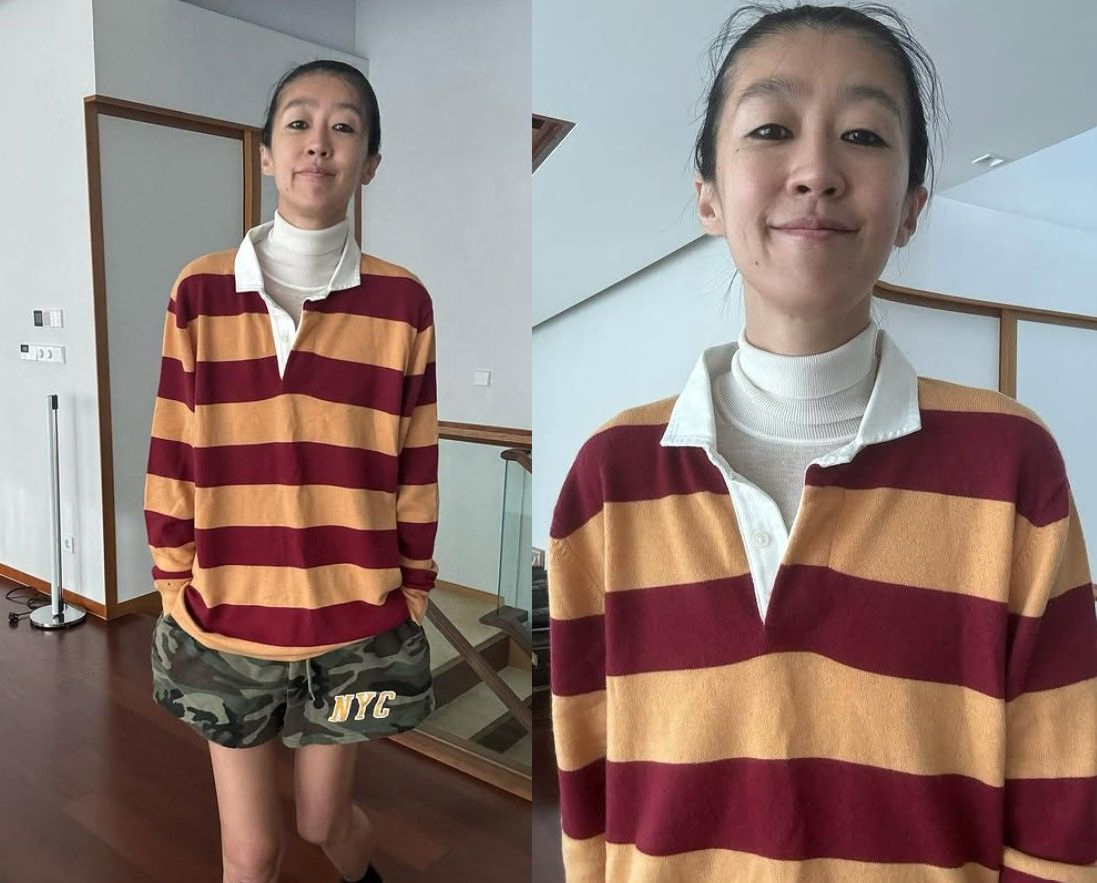 사진 속 홍진경은 줄무늬 PK 티셔츠 안에 아이보리 터틀넥 니트를 레이어드한 모습이다. 그는 플리츠 스커트, 청청 패션 등 다양한 룩을 입고 평소 선보이던 숏커트 헤어스타일이 아닌 묶은 머리를 연출해 눈길을 끌었다.