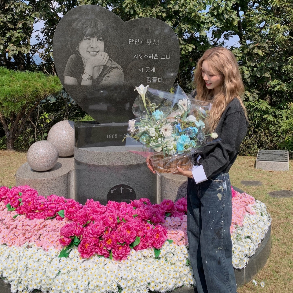 사진 속 최준희는 모친 묘역 앞에서 꽃다발을 한 아름 안은 채 미소 짓고 있다. 그는 외삼촌 최진영 묘소도 찾아 추모비에 기대 사진을 찍기도 했다.