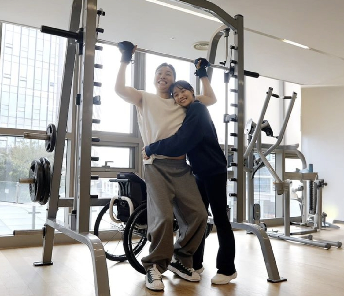 박위는 지난 7일 자신의 SNS(소셜미디어)를 통해 철봉을 잡고 두 발로 선 모습을 공개했다. 그 옆에 선 송지은은 남편을 안고 있어 눈길을 끈다.