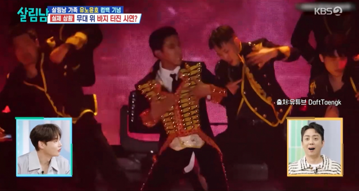 유노윤호가 과거 무대에서 춤을 추다가 바지가 찢어진 사건을 떠올렸다.