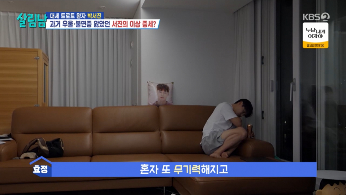 이날 박서진은 박효정과 분리수거를 하며 "인생 외롭다. 박스도 테이프라는 짝이 있는데. 가을은 남자한테 힘든 계절"이라며 무기력한 모습을 보였다.
