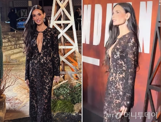 이날 데미 무어는 전신 레이스 장식에 가슴 부분이 깊게 파인 구찌의 커스텀 드레스를 입고 파격적인 클리비지 룩을 연출했다. 자연스러운 웨이브 헤어스타일을 연출한 데미 무어는 올해 63세의 나이가 믿기지 않는 탄력 몸매를 뽐내 시선을 사로잡았다.