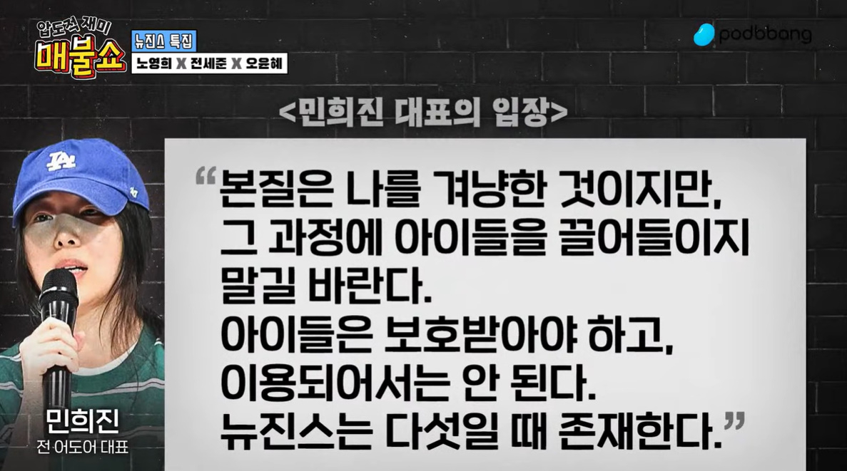노 변호사는 이런 민 전 대표의 입장에 대해 "5명의 모든 걸 만들어서 열심히 해줬는데 안타깝다는 얘기였고, 본인 때문에 멤버들이 불이익을 받으면 안 된다는 생각에 저런 얘기를 했다고 처음에 저한테 얘기를 해줬다"고 설명했다.