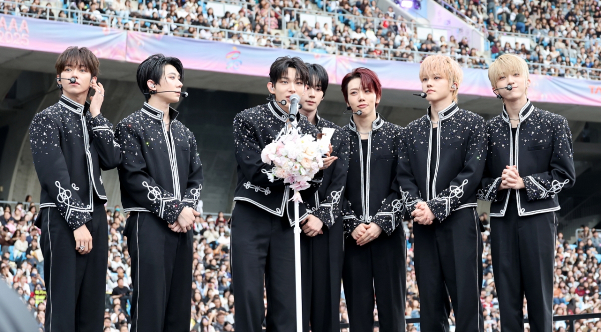 AAA 베스트 뉴 아티스트 상을 수상한 AHOF이 6일 대만 가오슝 내셔널 스타디움에서 진행된 스타뉴스 주최 '10주년 아시아 아티스트 어워즈 2025(10th Anniversary Asia Artist Awards 2025, '10주년 AAA 2025')에서 수상소감을 전하고 있다. 12월 6일~7일 양일에 걸쳐 가오슝 내셔널 스타디움에서 펼쳐지는 '10주년 아시아 아티스트 어워즈 2025(10th Anniversary Asia Artist Awards 2025, '10주년 AAA 2025')'와 페스타 'ACON 2025'는 MTN(머니투데이방송)과 위버스(Weverse)를 통해 각각 TV와 온라인 스트리밍으로 생중계 된다. 2025.12.06