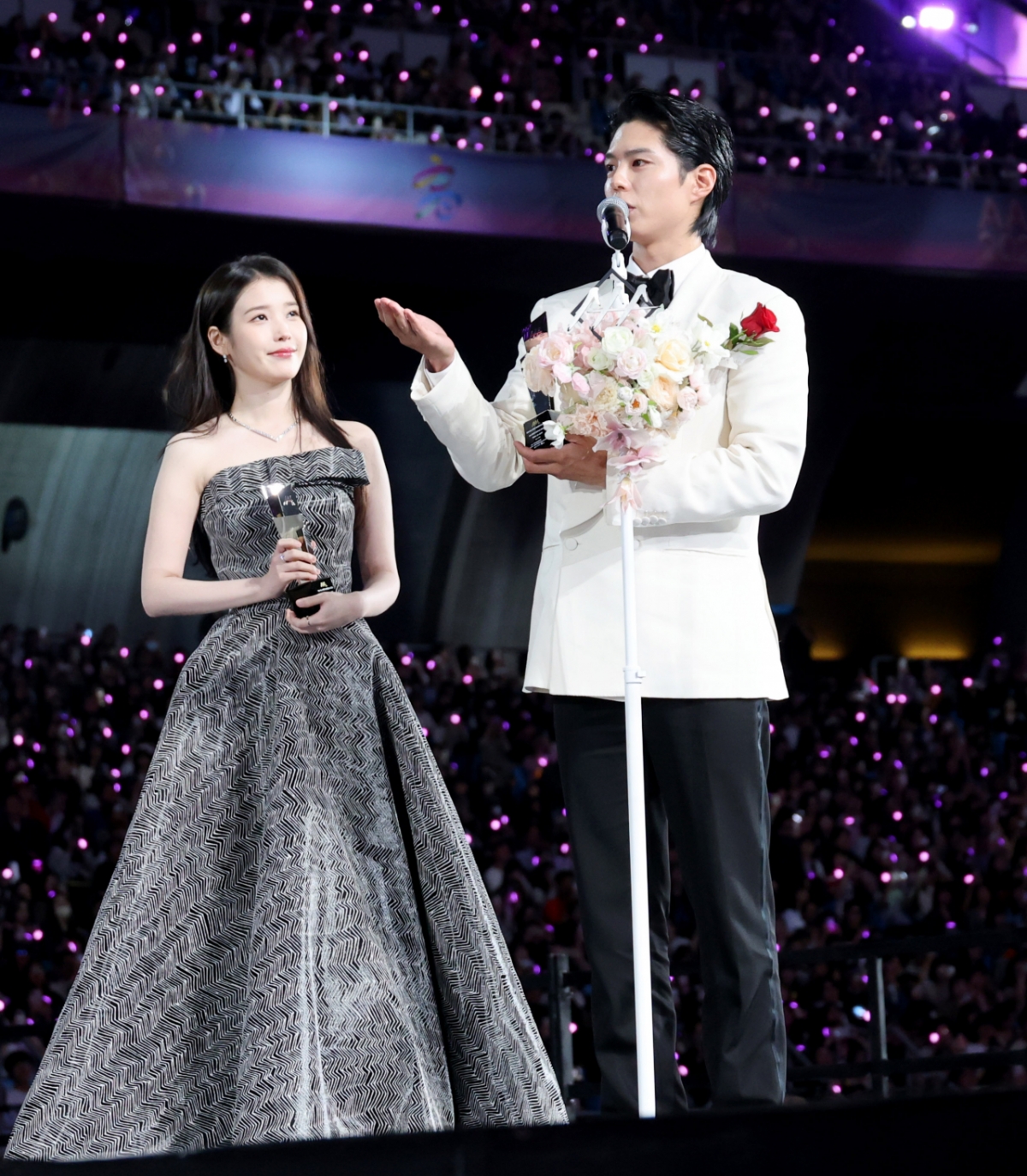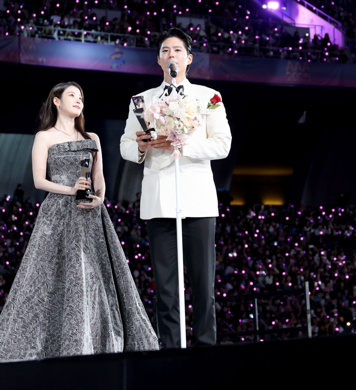 AAA 베스트 커플상 박보검 아이유가 6일 대만 가오슝 내셔널 스타디움에서 진행된 스타뉴스 주최 '10주년 아시아 아티스트 어워즈 2025(10th Anniversary Asia Artist Awards 2025, '10주년 AAA 2025')에서 수상소감을 전하고 있다. 12월 6일~7일 양일에 걸쳐 가오슝 내셔널 스타디움에서 펼쳐지는 '10주년 아시아 아티스트 어워즈 2025(10th Anniversary Asia Artist Awards 2025, '10주년 AAA 2025')'와 페스타 'ACON 2025'는 MTN(머니투데이방송)과 위버스(Weverse)를 통해 각각 TV와 온라인 스트리밍으로 생중계 된다. 2025.12.06