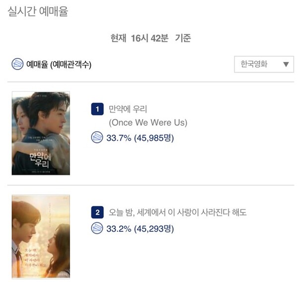 오는 31일 개봉하는 영화 '만약에 우리'는 언론의 호평과 강력한 입소문에 힘입어 이틀 연속 한국 영화 박스오피스 1위에 오른 '오늘 밤, 세계에서 이 사랑이 사라진다 해도'를 제치고 한국 영화 예매율 1위에 등극했다.