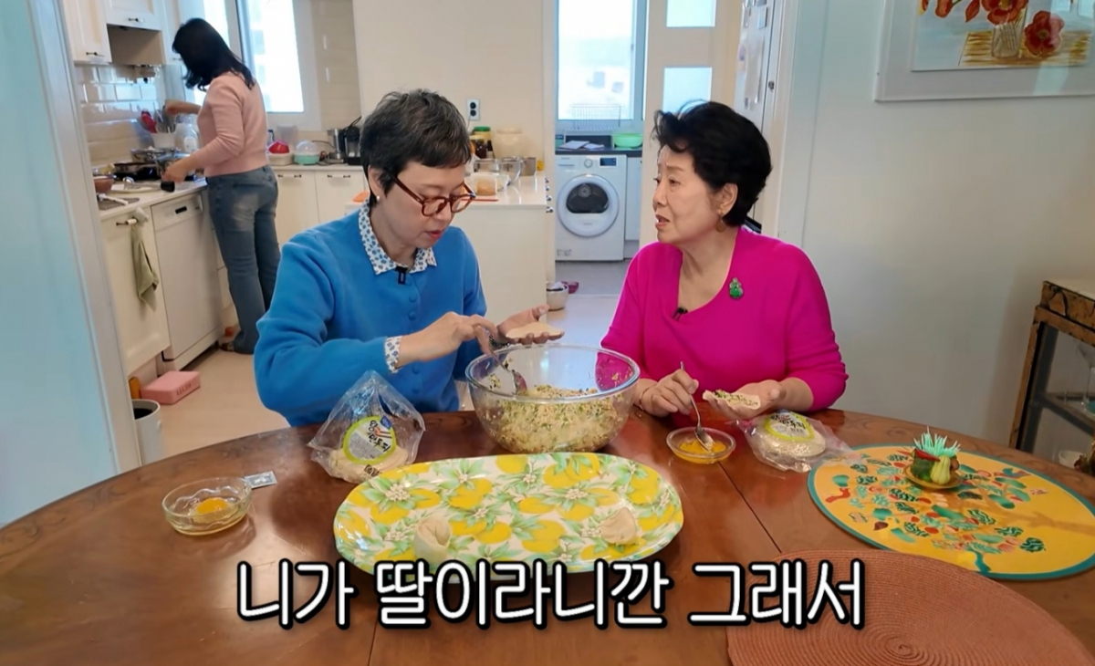 박미선은 만두를 빚으며 "오랜만에 만들어 본다. 옛날엔 모여 앉아 만두 많이 빚었다"며 과거를 떠올렸다. 이에 선우용여는 "그게 추억이고 정"이라면서 "요샌 바쁘니까 다 떨어져 살지 않나. 잘못하면 남남"이라고 토로했다.