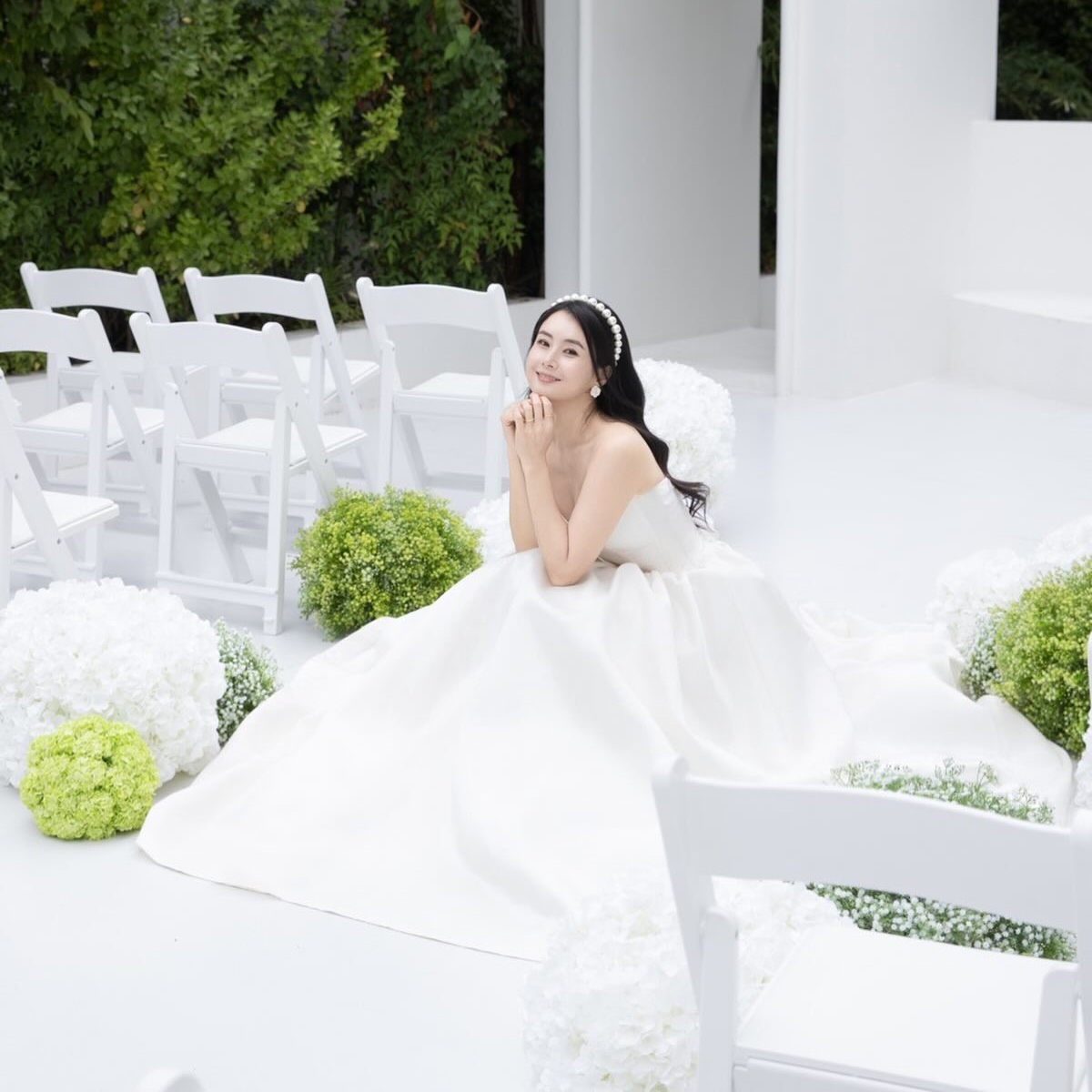 사진 속 최정윤은 순백 웨딩드레스를 입은 채 결혼식장 버진로드에 앉아 포즈를 취하고 있다. 카메라를 바라보며 어느 때보다 환한 미소를 짓는 모습이 눈길을 끈다.
