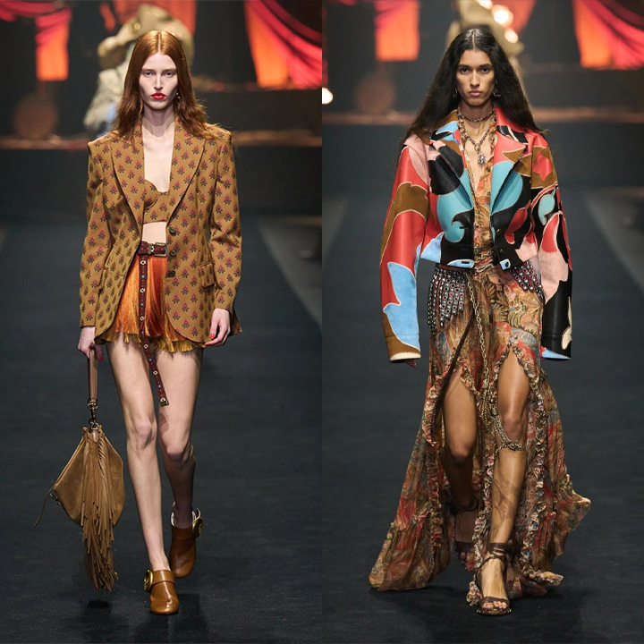 에트로는 런웨이에서 장다아가 착용한 재킷과 블라우스를 각각 다른 룩으로 선보였다. 패턴 재킷은 같은 무늬의 브라톱과 화려한 프린지 장식 스커트를 매치해 관능적인 분위기로 연출했다.