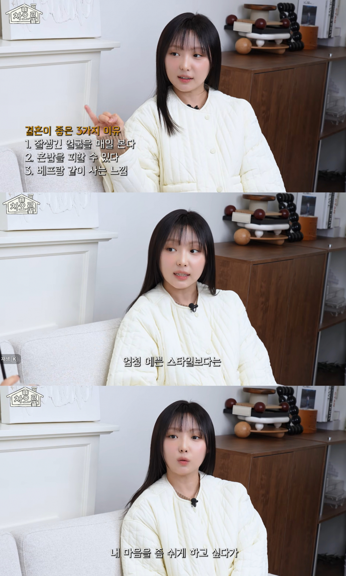 민은 결혼 생활이 어떻냐는 질문에 "너무 좋다"고 답했다. 결혼이 좋은 이유를 세 가지 꼽아달라고 하자 민은 "잘생긴 얼굴을 매일 본다, 혼밥을 피할 수 있다, 베스트 프랜드랑 계속 같이 사는 것 같다"고 말했다.