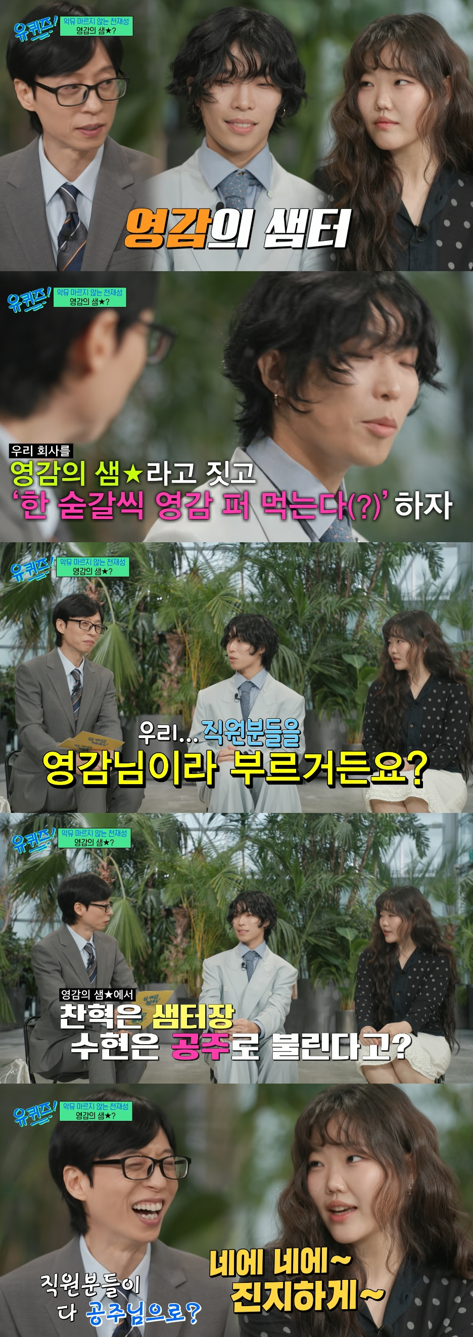 고 영감은 "전 직장보다는 복지가 다운그레이드라고 생각했는데 막상 즐겨보니 '생각보다 좋은데?' 싶었다. 두 달 정도 일해 보니까 저의 인생을 걸어볼 수 있을 정도 같다"고 말해 이찬혁을 만족스럽게 했다. 이수현은 "인생을 건다고요?"라며 목을 긁적이는 상반된 반응으로 웃음을 더했다.