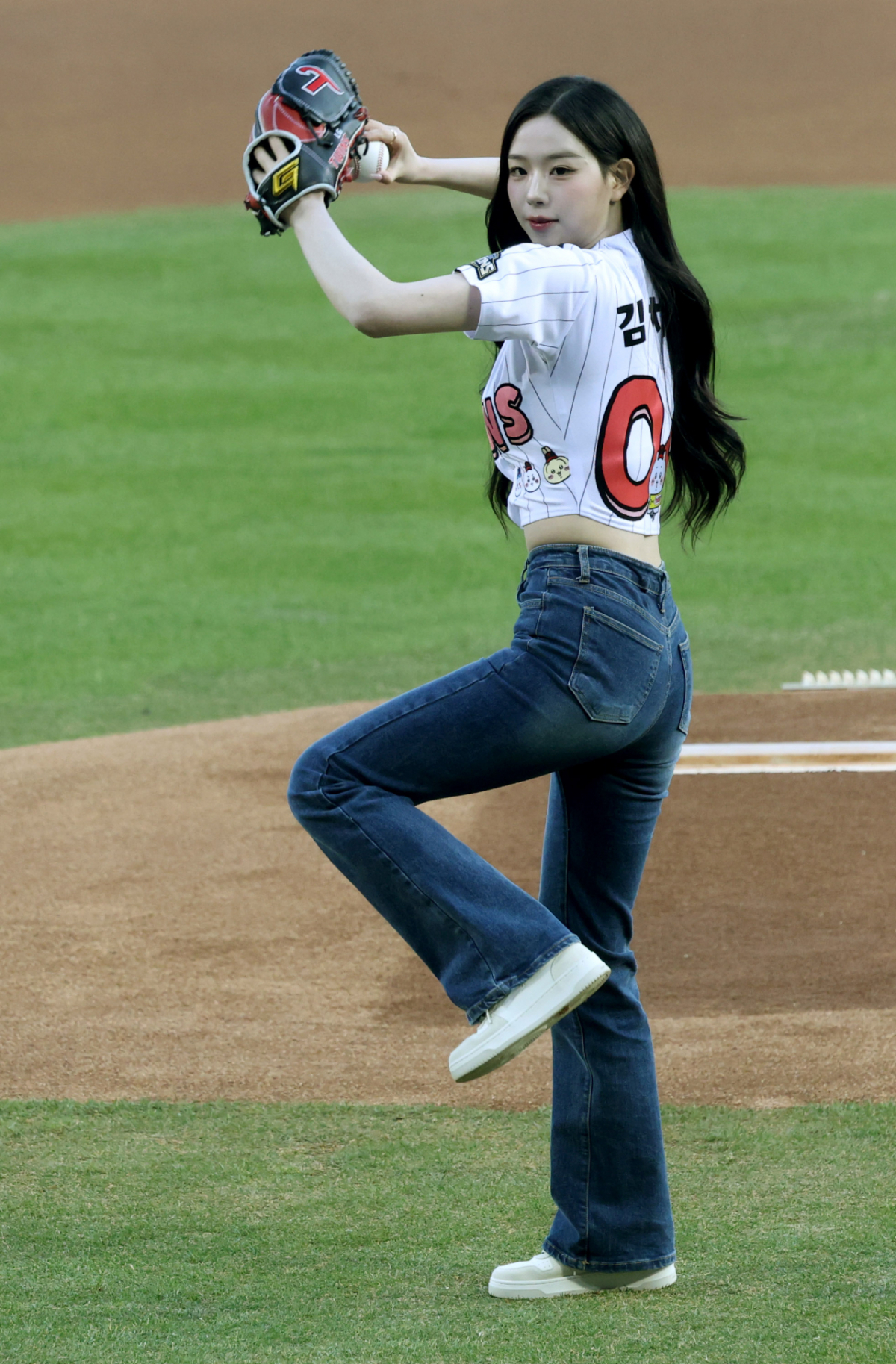 걸그룹 트리플에스(tripleS) 멤버 김채연이 LG 승리기원 시구를 하고 있다.