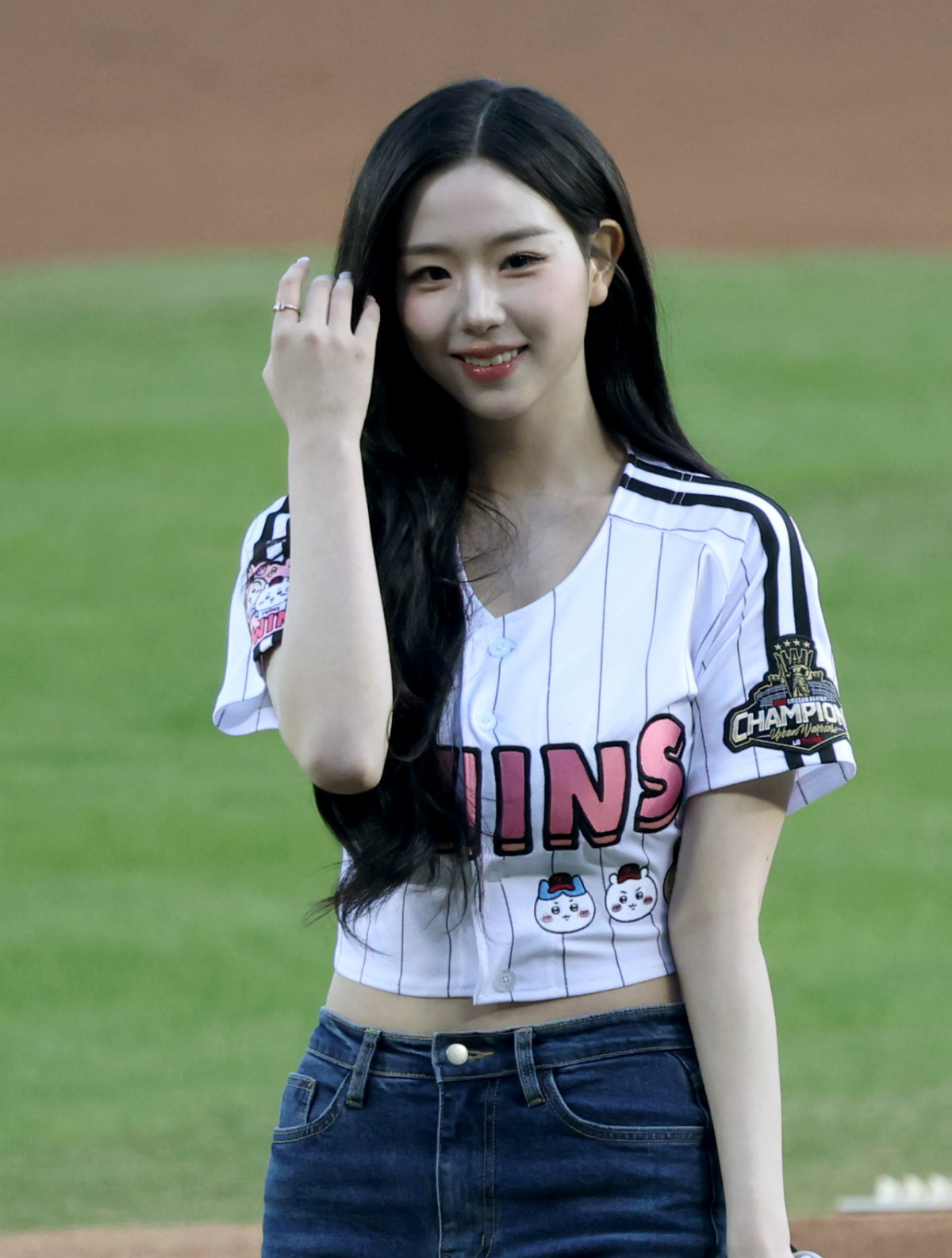 걸그룹 트리플에스(tripleS) 멤버 김채연이 LG 승리기원 시구를 하고 있다.