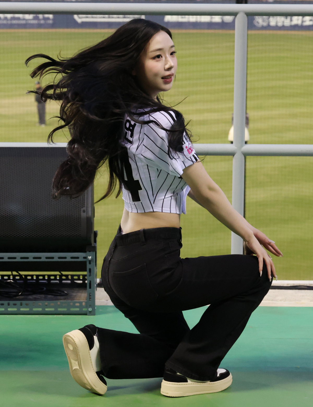 걸그룹 트리플에스(tripleS) 멤버 김채연이 LG 승리기원 시구를 한 후 응원단상에 올라 스페셜 치어리딩을 하고 있다.
