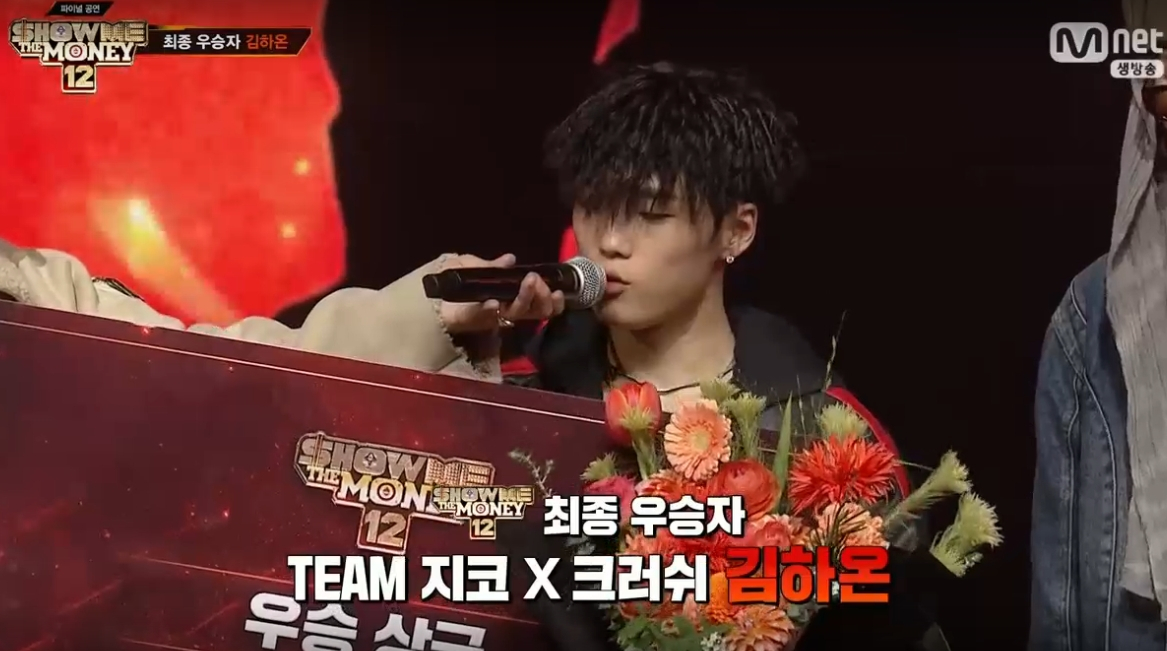 김하온은 "제가 '쇼미12'에 나오기로 한 이후로 지금 이순간만이 제 시나리오에 있었다"며 "우여곡절 끝에 여기까지 오게 해준 지코, 크러쉬 형에게 영광을 돌린다"고 우승 소감을 밝혔다.