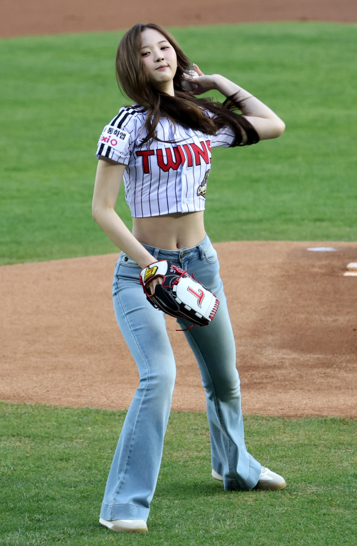 그룹 트리플에스(tripleS) 멤버 이지우가 LG 승리기원 시구를 하고 있다. 시타는 정하연이 맡았다.