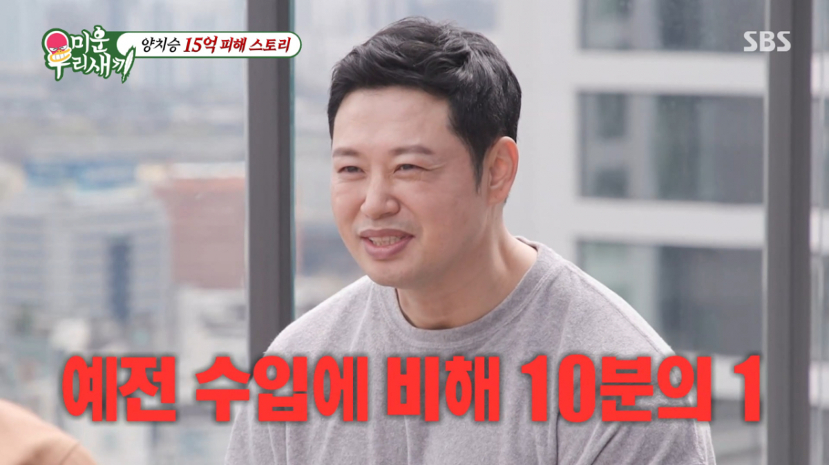 양치승이 15억 원대 피해로 헬스장을 폐업한 뒤 아파트 커뮤니티 관리 일을 하며 수입이 과거의 10분의 1로 줄었다고 밝혔다.