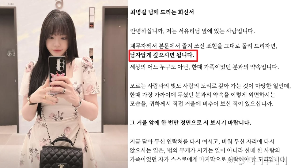 법조계 종사자로 알려진 방송인 서유리의 현재 남자친구가 그의 전남편 최병길 PD를 향해 채무이행을 요구했다.