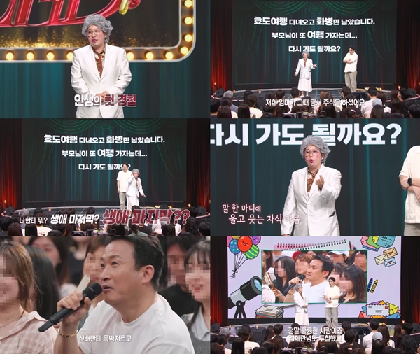 이번 '말자쇼'에서는 "처음 부모님과 효도 여행 다녀오고 화병만 남았는데 부모님이 또 여행 가자고 하신다"는 고민이 등장했다. '말자 할매' 김영희는 자신의 경험담을 바탕으로 가족들과의 갈등을 슬기롭게 해결하는 방법을 제안했다.