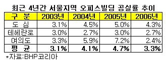 6일 부동산컨설팅 기업인 BHP코리아가 지난해 12월 말 기준 서울 소재 프라임 오피스빌딩 120여개 가운데 임대 중인 93개 빌딩을 대상으로 조사한 결과 2006년 4/4분기 서울지역 오피스빌딩 공실률은 1/4분기(4.1%)에 비해 1.7% 포인트 하락한 2.4%를 기록했다.